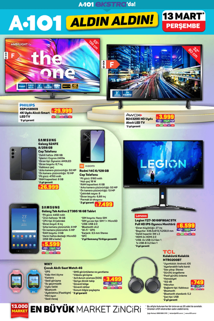 A101, 13 Mart tarihli aktüel kataloğu ile her bütçeye uygun fırsatlar sunuyor. Eğer teknolojiden ev gereçlerine kadar çeşitli ürünlerde indirimli fiyatlarla alışveriş yapmayı planlıyorsanız, A101 mağazalarına uğramayı unutmayın. Ürünler stoklarla sınırlıdır, bu yüzden erken hareket etmekte fayda var!