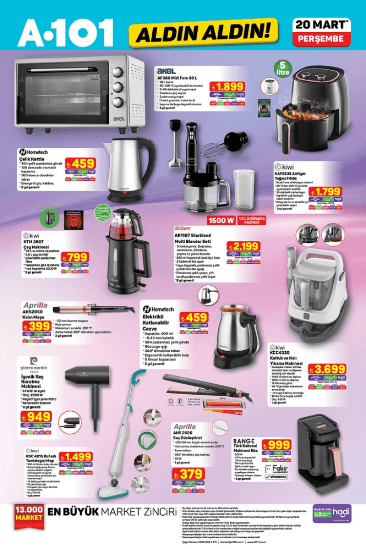 A101, 20 Mart Perşembe günü mağazalarında satışa sunacağı yeni aktüel ürünlerini duyurdu. Bu hafta, evdeki birçok ihtiyaca hitap eden ürünler, büyük indirimlerle raflarda yerini alacak. Elektronikten, beyaz eşyaya, ev aletlerinden mobilya ve oyuncaklara kadar geniş bir ürün yelpazesiyle müşterilerin karşısına çıkacak olan A101, fırsatlar sunmaya devam ediyor. İşte 20 Mart Perşembe günü A101 mağazalarındaki aktüel ürünlerin tam listesi:
