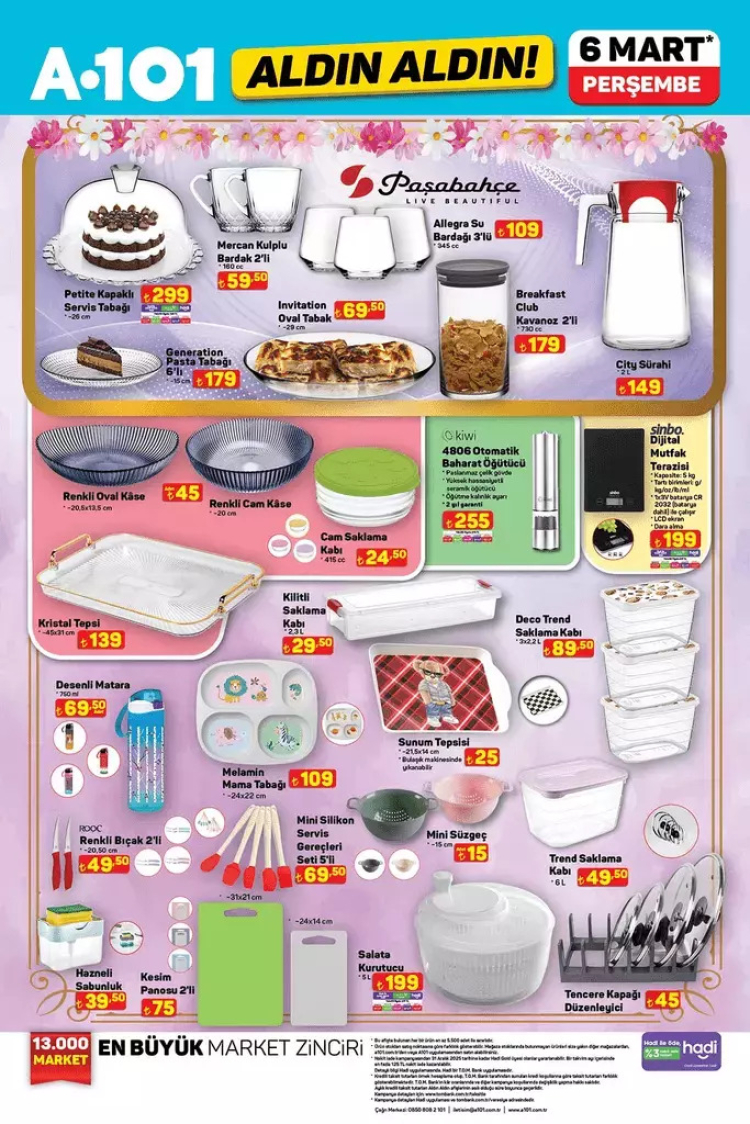 Bu hafta A101 mağazalarındaki fırsatlar sizi bekliyor. Erken saatlerde gitmeniz, bu ürünleri stoklar tükenmeden almak için faydalı olacaktır. A101 6 Mart Perşembe aktüel kataloğundaki indirimli ürünlerle dolu alışveriş keyfini kaçırmayın!