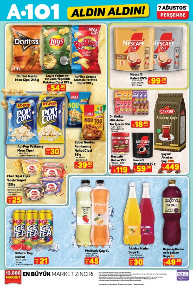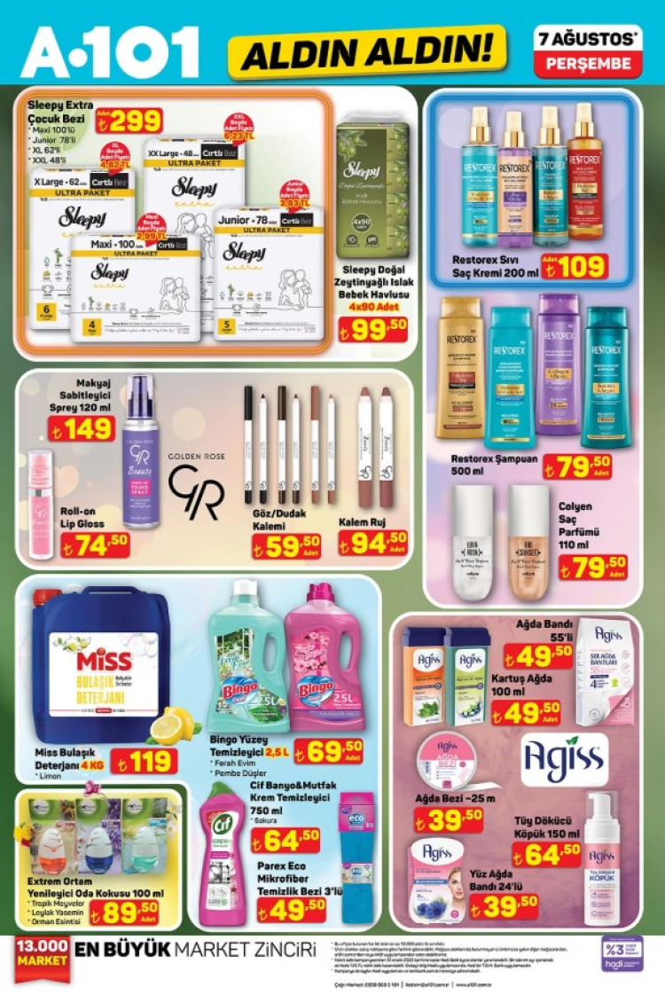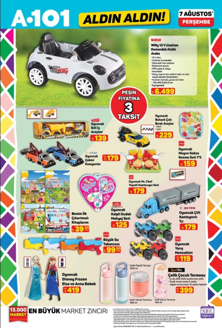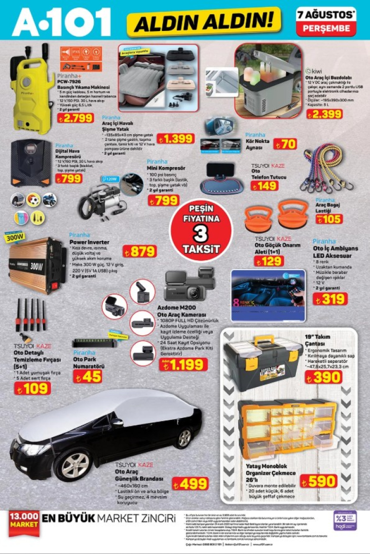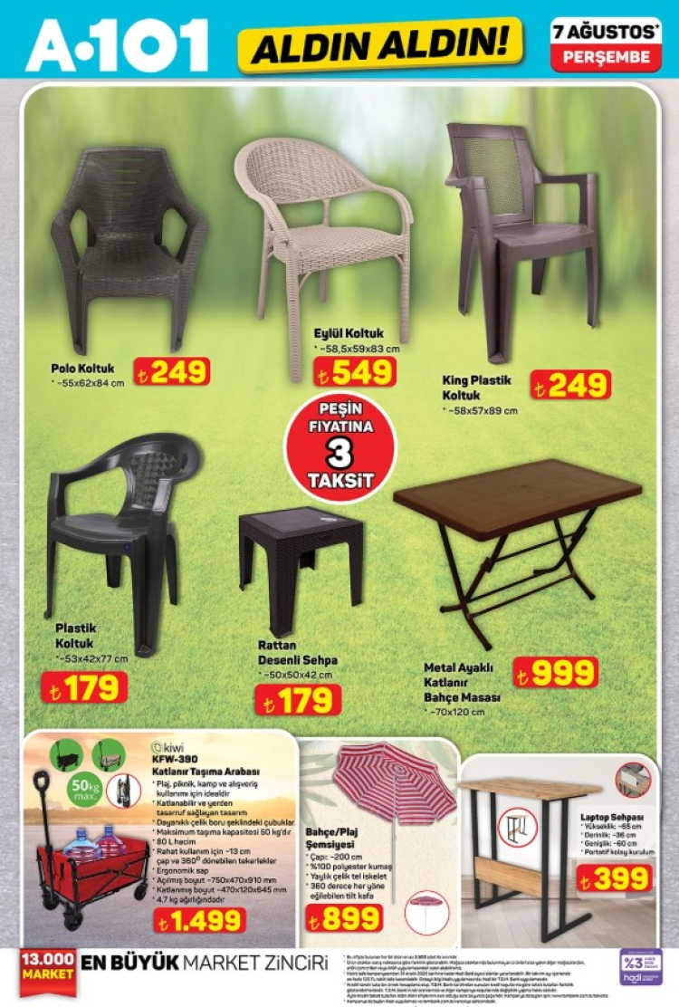 Türkiye genelindeki A101 mağazalarında 7 Ağustos 2025 Perşembe gününden itibaren geçerli olacak aktüel ürünler kataloğu tüketicilerle buluştu. Her hafta perşembe günleri yoğun ilgi gören "Aldın Aldın" kampanyası kapsamında bu hafta da dikkat çeken ürünler raflardaki yerini alacak. A101, özellikle yaz sezonu için kamp malzemeleri, ev içi kullanım için elektrikli küçük ev aletleri ve çocuklar için oyuncak kategorisinde oldukça avantajlı fiyatlar sunuyor.