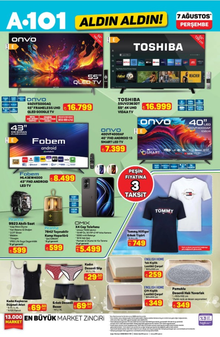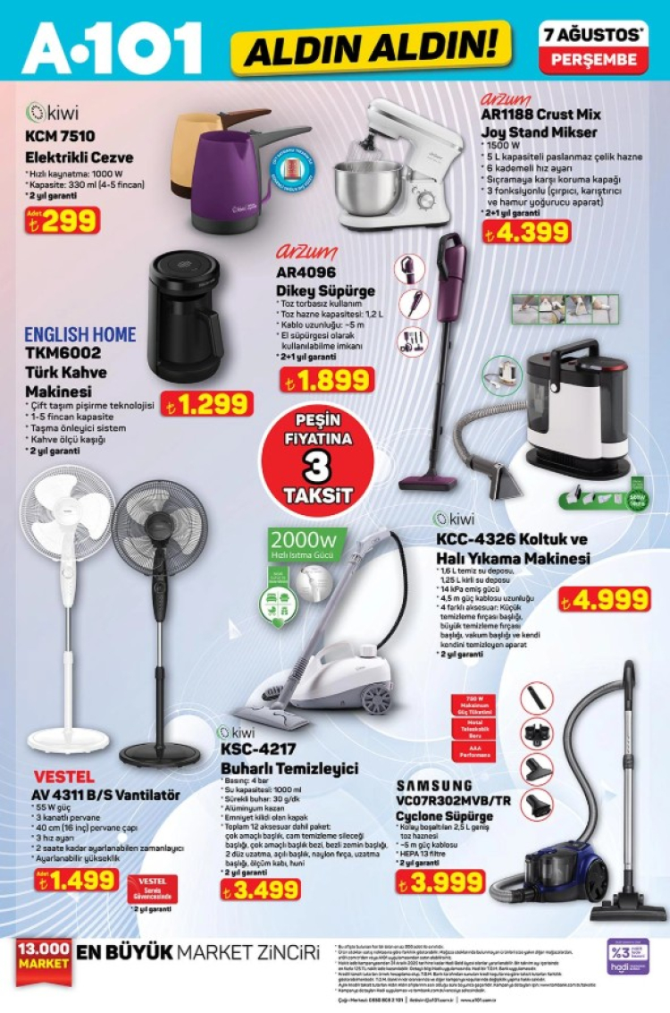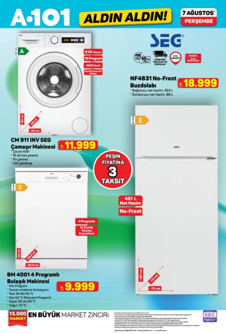 A101, 7 Ağustos Perşembe günü satışa sunacağı "Aldın Aldın" etiketli indirimli ürünler kataloğunu yayınladı. Beyaz eşyadan elektrikli ev aletlerine, kamp ürünlerinden mutfak gereçlerine kadar uzanan geniş ürün yelpazesi uygun fiyatlarla dikkat çekiyor.