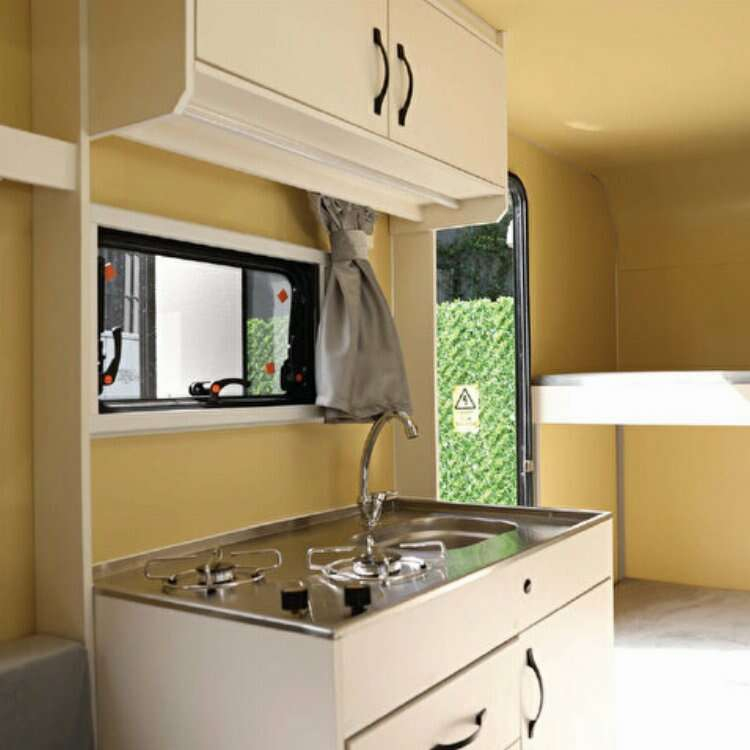 2 ocaklı, krom lavabolu mutfak sistemi ve duş bölümü