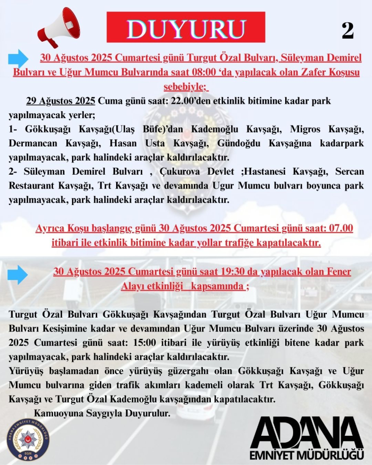 Adana Emniyet Müdürlüğü, 30 Ağustos Zafer Bayramı kutlamaları dolayısıyla kent genelinde uygulanacak trafik düzenlemelerini duyurdu. Kutlamaların yapılacağı alanlarda hem araç trafiğine kısıtlamalar getirilecek hem de bazı bölgelerde park yasağı uygulanacak.
