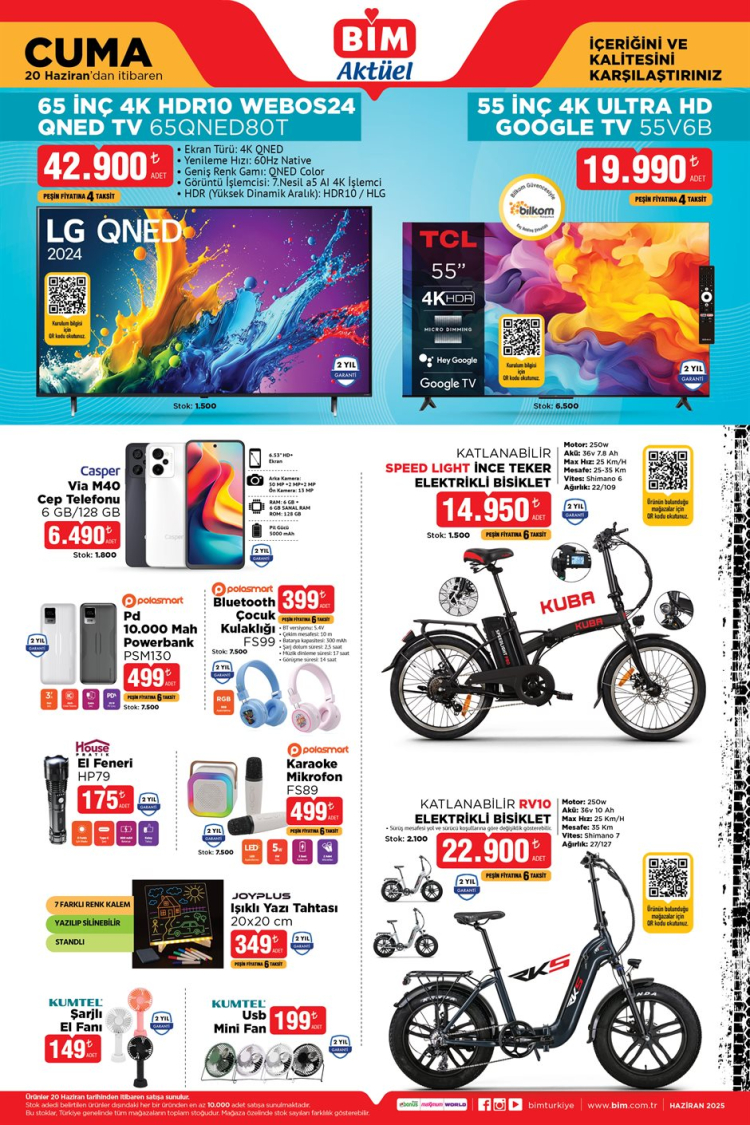 BİM’in 20 Haziran 2025 Cuma günü raflara koyacağı aktüel ürünler kataloğu yayınlandı. Katalogda yer alan dikkat çekici fırsat ürünleri arasında televizyonlar, robot süpürge, kamp ekipmanları, mutfak gereçleri ve tekstil ürünleri öne çıkıyor.