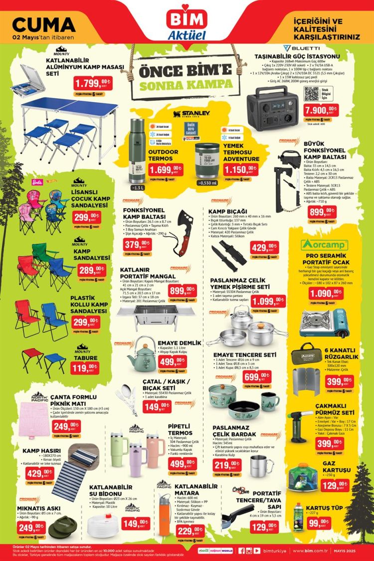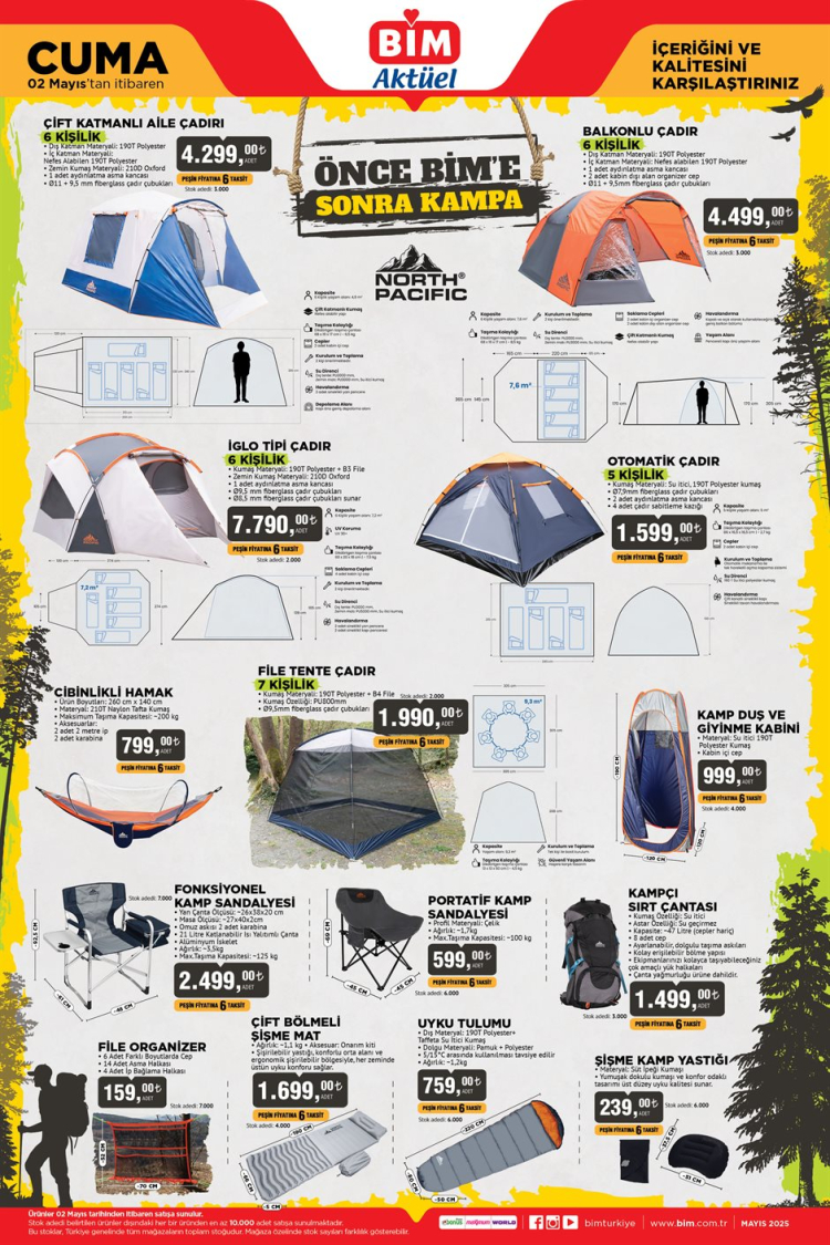 Yaz tatilinin yaklaşmasıyla birlikte, kamp yapmayı sevenler için de birçok ürün Bim’de satışa sunuluyor. Dayton XL Şişme Kamp Matı 2.290 TL, Smooth Comfort Çift Kişilik Şişme Yatak 4.990 TL, ve Easy Travel Uyku Tulumu 1.690 TL gibi ürünler, doğada konforlu bir yaşam alanı oluşturmak isteyenlerin ilgisini çekecek.