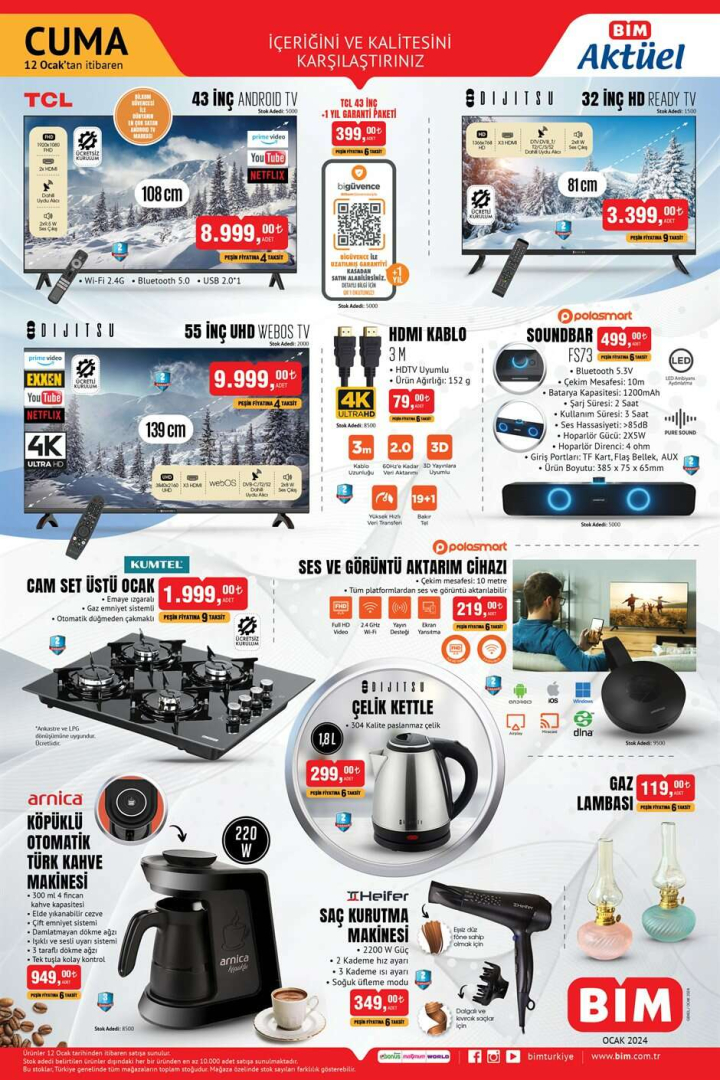 BİM aktüel ürünler kataloğu 12 Ocak 2024 Cuma günü için yayına verildi. Her Salı ve Cuma günleri yeni ve indirimli ürünlerini raflara dizen dev market zincirinde bu haftanın fırsatları belli oldu. BİM'de bu Cuma televizyon, soundbar, cam set üstü ocak, ısıtıcı, çelik kettle, saç kurutma makinesi, çok amaçlı dolap gibi birçok ürün alıcısıyla buluşuyor. 4 fincan kahve kapasiteli köpüklü otomatik Türk kahvesi makinesi ise bu haftanın yıldızları arasında yerini aldı. Alışveriş severler şimdiden listelerini hazırlıyor. Peki, Bu hafta BİM aktüel ürünler kataloğunda neler var, hangi ürünler indirimde? İşte, 12 Ocak 2023 BİM katalog aktüel indirimleri...
