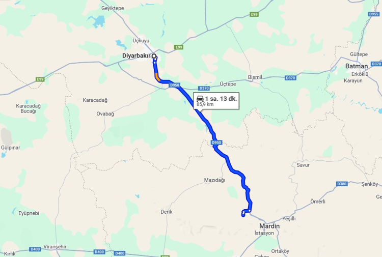 Diyarbakır’dan Mardin’e özel araçla seyahat etmek isteyen vatandaşlar, D950 karayolu üzerinden 93,6 kilometrelik bir yolculuk yapar. Yol koşullarının normal olduğu varsayıldığında bu yolculuk: