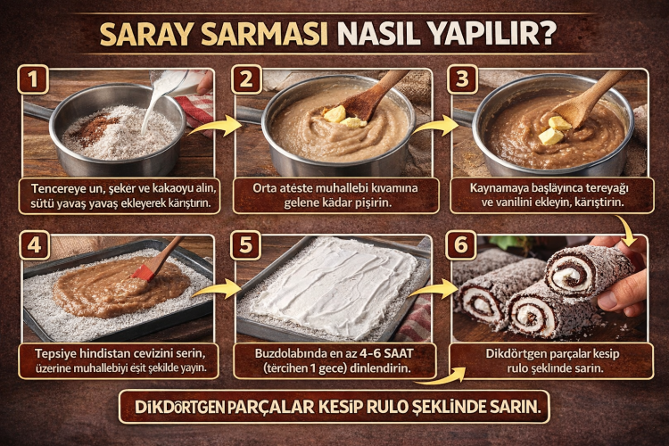 Tatlı severlerin favorileri arasında yer alan saray sarması, hem hafif hem de pratik yapımıyla dikkat çekiyor. Sütlü yapısı sayesinde ağır tatlılara alternatif olan bu lezzet, özellikle bayram ve özel gün sofralarında sıkça tercih ediliyor. “Sultan sarması” ve “sadrazam lokumu” olarak da bilinen bu tatlı, kıvamı ve görüntüsüyle adeta iştah kabartıyor.