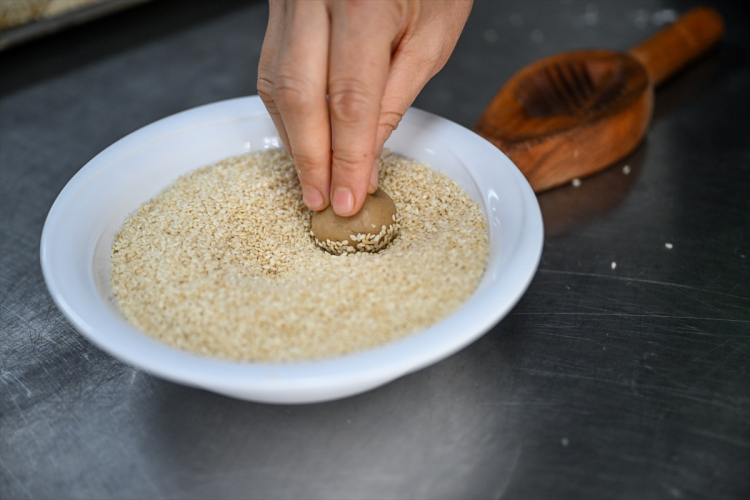 İsteğe bağlı olarak hazırlanan hamur bir gece buzdolabında dinlendirilir. Dinlenen hamur susama batırıldıktan sonra geleneksel tahta kalıba yerleştirilir. Kalıbın şeklini alan hamur tepsiye dizilir.