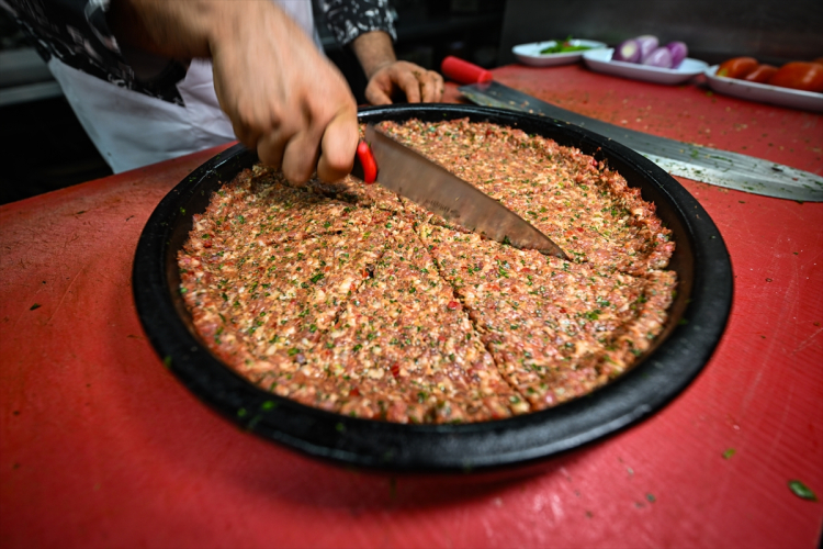 Hazırlanan et harcı tepsiye eşit şekilde yayılır ve üzeri dilimlenir.