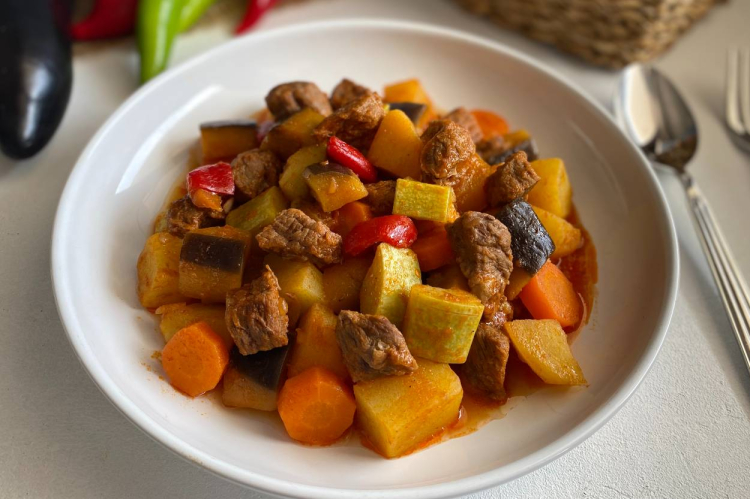 Etleri tavada mühürleyin, biraz sıcak su ekleyip 15 dakika pişirin. Sırasıyla soğan, sarımsak, patates, patlıcan ve kabakları ekleyin. Salça, baharat ve zeytinyağı ekleyin, sıcak su ekleyip kapağını kapatın. 40 dakika pişirin, tereyağını ekleyip karıştırın. Sıcak servis edin.