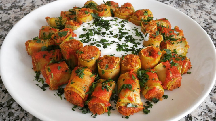 Tavuk göğsünü tavada pişirin, soğan, sarımsak ve biber ekleyin. Salça ve baharatları ekleyip karıştırın. İnce dilimlenmiş kabakların içine tavuklu harcı koyun, sarıp kürdanla sabitleyin. Sosu üzerine dökün ve 25 dakika pişirin.