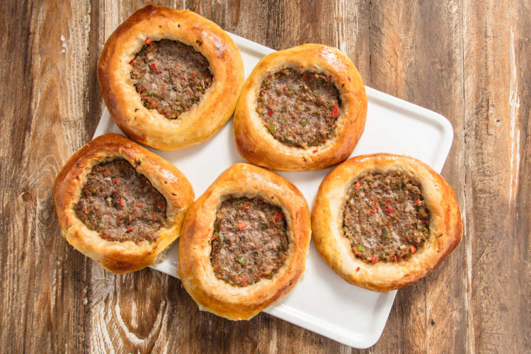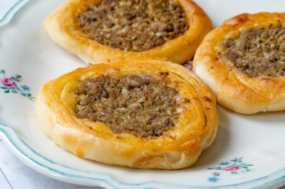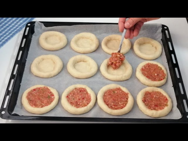 Hamuru Şekillendirin: Mayalanmış hamurdan ceviz büyüklüğünde parçalar koparın ve elinizle 10 santimetre çapında açın. Hamurun ortasına iç harçtan bir tatlı kaşığı koyun ve bohça gibi kapatın.