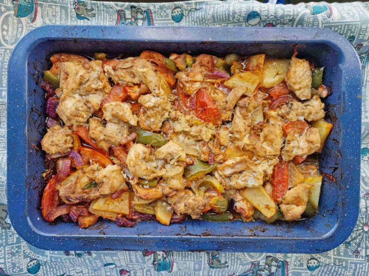 Sebzeleri yıkayın ve iri şekilde doğrayın. Aynı şekilde tavukları da doğrayın. Doğradığınız sebzeleri bir tepsiye yerleştirin.