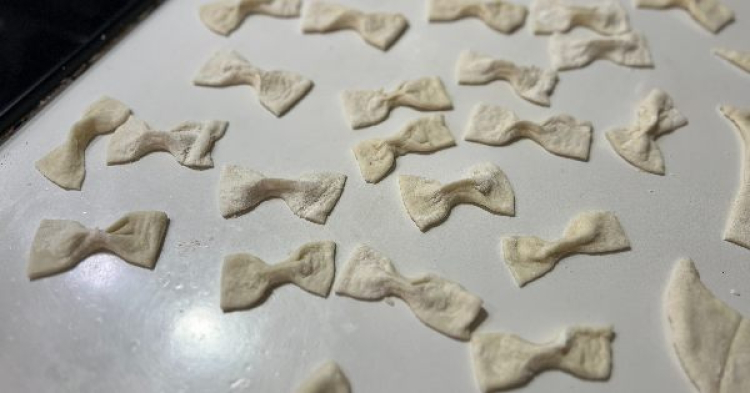Dinlenen hamuru unlanmış tezgâh üzerinde merdaneyle açın. Küçük kare veya dikdörtgen parçalar halinde kesin. Her bir parçanın ortasına parmakla bastırarak “kelebek” formu verin.