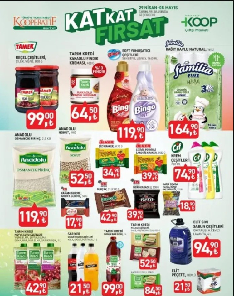 Tarım Kredi Kooperatif Marketleri, 29 Nisan – 5 Mayıs 2025 tarihleri arasında geçerli yeni aktüel ürün kataloğunu yayımladı. Cif krem, yumuşatıcı, kağıt havlu gibi temizlik ürünleriyle birlikte çay, tavuk, reçel, ton balığı ve bakliyatlar indirimli fiyatlarla raflardaki yerini aldı.