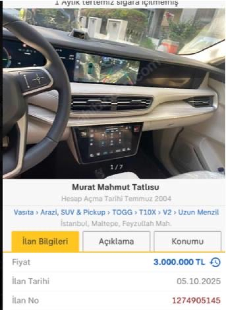 Bakanlık tarafından yapılan açıklamada, bir elektrikli araç ilanında aracın markanın resmi internet sitesindeki liste fiyatının yaklaşık 172.000 TL üzerinde pazarlanması üzerine idari yaptırım uygulandığı belirtildi.