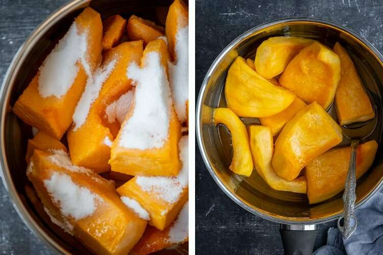 Öncelikle balkabağını dilimler veya küpler halinde kesin ve soyun. Bunları büyük bir tencereye yerleştirin.Şekeri kabak dilimlerinin üzerine eşit şekilde dökün.