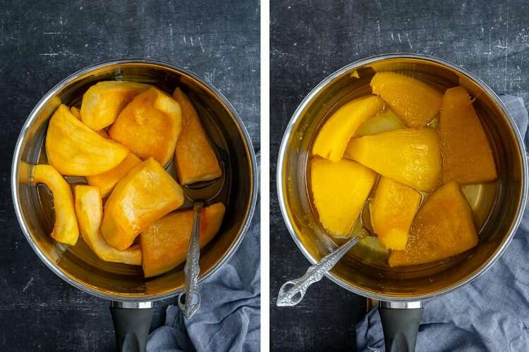Tencereyi orta ateşe koyun ve kaynatın. Daha sonra kaynatmak için ısıyı azaltın. Balkabağı dilimlerini yumuşayana kadar fakat yumuşak olmayana kadar pişirin. Suyu kaynadıkça şurup kıvamına gelecektir. Tüm kabak dilimlerinin şerbetle kaplandığından emin olun. Bu kabak çeşidine bağlı olarak 20 ila 40 dakika arasında sürebilir.