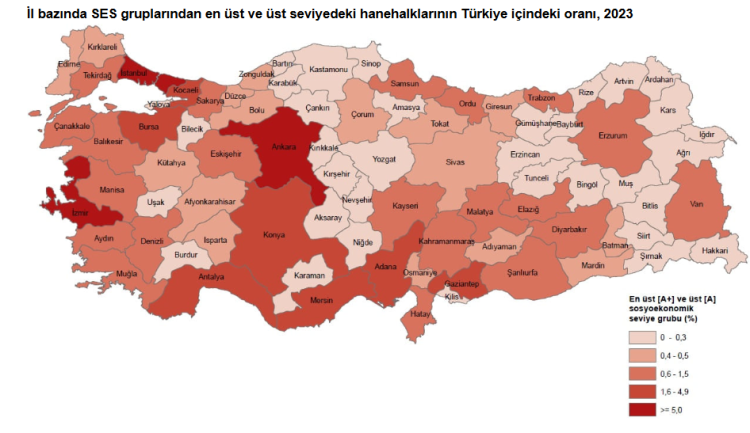 İl düzeyinde en üst [A+] ve üst [A] sosyoekonomik seviye gruplarındaki hanehalkları, Türkiye içindeki oranlarına göre sıralandığında, bu seviyelerdeki hanehalklarının en fazla olduğu iller %28,6 ile İstanbul, %11,5 ile Ankara, %6,7 ile İzmir, %3,9 ile Bursa ve %3,3 ile Antalya oldu.