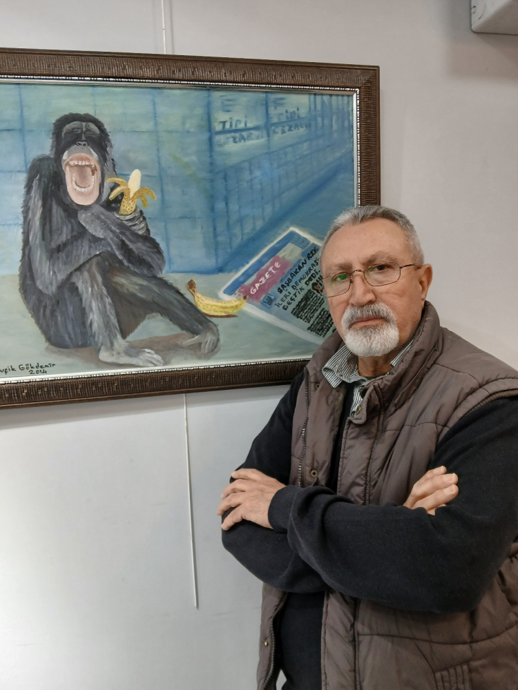 Tevfik Gökdemir de tablosuyla özdeşleşmiş, muz yiyen bir maymunu betimlemiş. Maymun insansal duruşuyla ben de varım diyor. Ayrıca, gülüşü, ağzını açışı, rahat bir yaşamın anlamını veriyor…