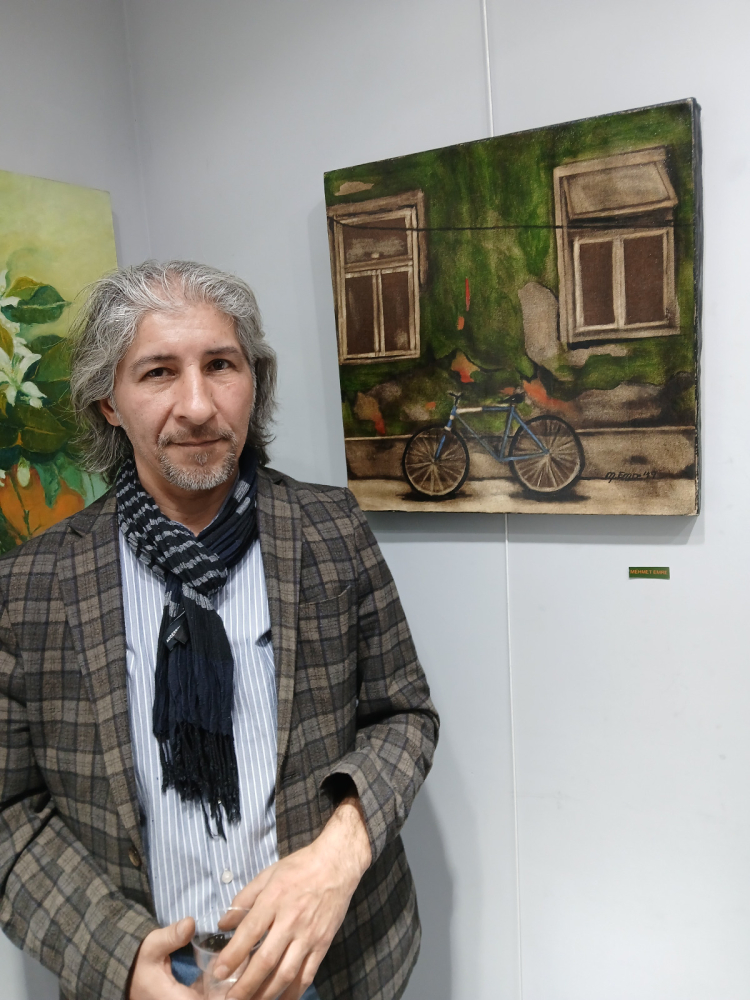 Mehmet Emre, tablosunun önünde görülüyor, Yeşilin tonlarıyla bezenmiş duvarın önünde bir bisiklet duruyor, çalışma işlevini temsil ediyor. Yaşamanın gizini yansıtıyor.