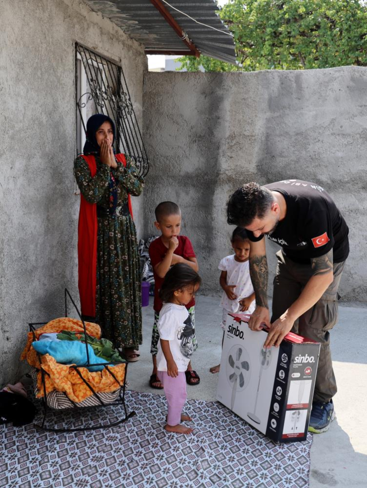 Ogün Abi Derneği Başkanı Ogün Sever Okur, “Özellikle bu çinko evlerde klima takılsa dahi bir etkisi olmuyor. O nedenle vantilatör en iyisi. Çocuklar genelde sıcaktan dolayı isilik oluyor. Adana sıcağına karşı en azından bir nebze de olsa bu vantilatörler iyi geliyor. Şimdiye kadar yüzlerce aileye dağıttık ve yaz bitene kadar dağıtmaya devam ediyoruz. Yazın vantilatör, kışın da soba dağıtacağız” ifadelerini kullandı.