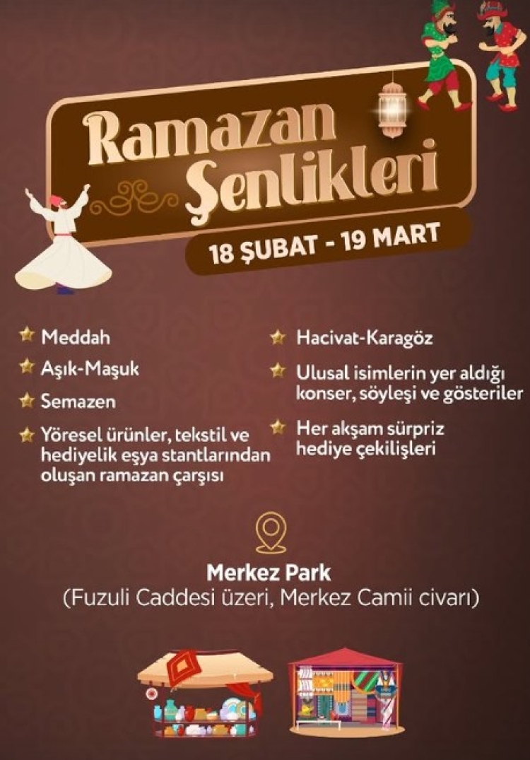 Ramazan Şenlikleri kapsamında Merkez Park’ta kurulan Ramazan Çarşısı’nda yöresel ürünler, tekstil ve hediyelik eşya stantları ziyaretçileri ağırlıyor. Etkinlik programında meddah, Aşık-Maşuk, semazen gösterileri ile Hacivat-Karagöz gibi geleneksel Ramazan eğlenceleri yer alıyor. Ayrıca ulusal isimlerin katılacağı konser, söyleşi ve gösteriler de program kapsamında gerçekleştirilecek.