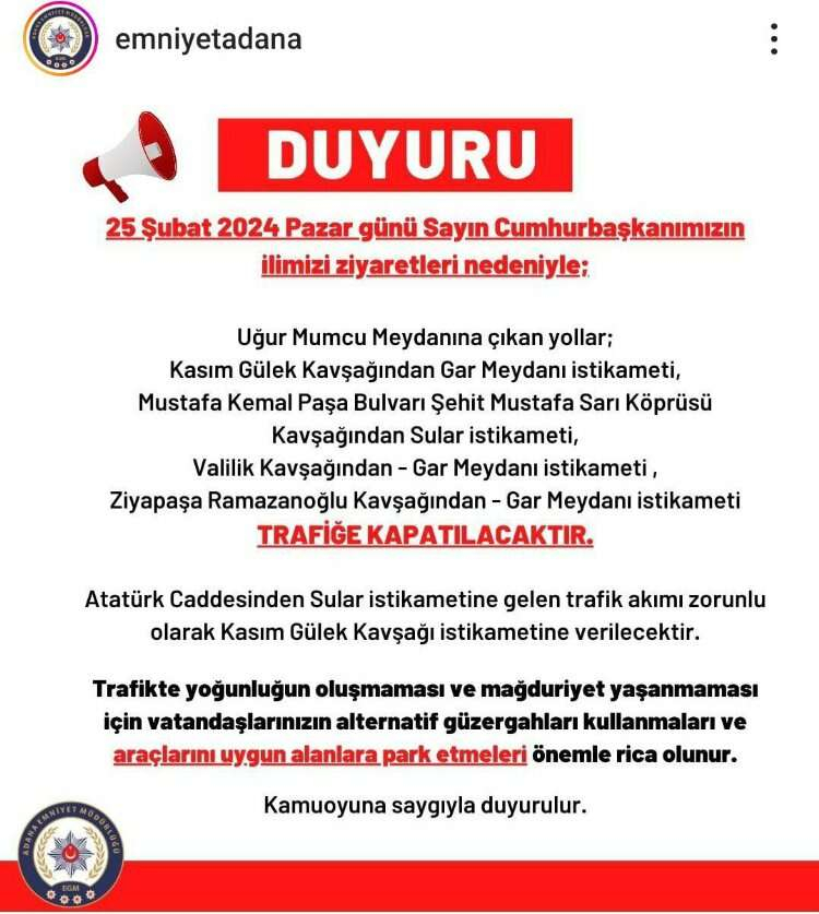 "25 Şubat 2024 Pazar günü Sayın Cumhurbaşkanımızın ilimizin ziyaretleri nedeniyle; Uğur Mumcu Meydanı'na çıkan yollar; Kasım Gülek Kavşağından Gar Meydanı istikameti, Mustafa Kemal Paşa Bulvarı Şehit Mustafa Sarı Köprüsü Kavşağından Sular istikameti, Vali Kavşağından Gar Meydanı istikameti, Ziyapaşa Ramazanoğlu Kavşağından Gar Meydan istikameti trafiğe kapatılacaktır.