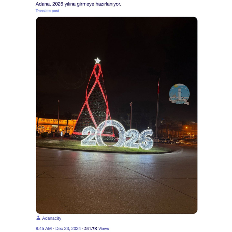 Bir sosyal medya hesabı, 23 Aralık 2024 tarihindeAdana'nın Uğur Mumcu Meydanı'nda çekildiği iddia edilen bir fotoğrafı paylaştı. Fotoğrafın, Adana'nın 2025 yılına girerken 2026 yılına ait kutlamalar yapıldığını gösterdiği öne sürüldü. Bu iddia, kısa süre içinde 300 binden fazla gösterim aldı ve geniş bir takipçi kitlesi tarafından paylaşıldı.