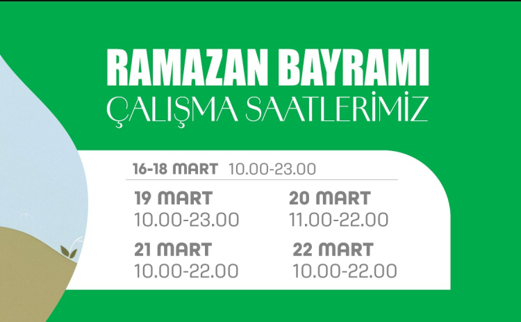 Bayramın ilk günü olan 20 Mart’ta AVM’nin açılış saati 11.00 olarak belirlenirken kapanış saati 22.00 olacak. Diğer günlerde ise daha erken açılış saatleri uygulanacak.
