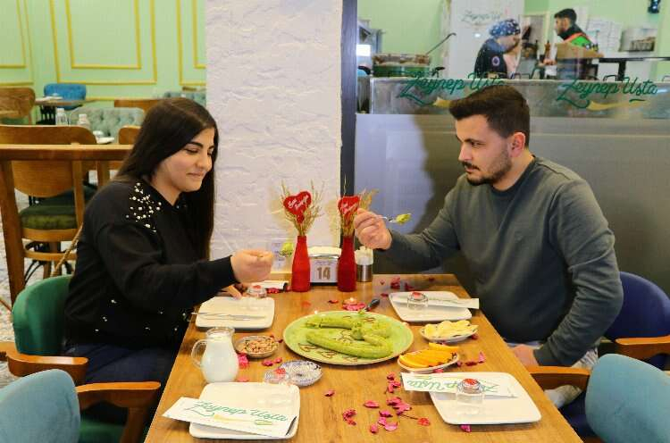Kentte uzun yıllardır tatlıcılık yapan Zeynep Geyik, Sevgililer Günü'nde birbirlerine hediye sunma arayışa giren çiftlere alternatif sunmak için 14 Şubat'a özel kalp şeklinde katmer hazırladı. Geyik, gelen çiftlerin masalarına katmeri kalp şeklinde servis ediyor. Ayrıca kadın tatlıcı, masaları gül yapraklarıyla süsleyip mum koymayı da ihmal etmedi.