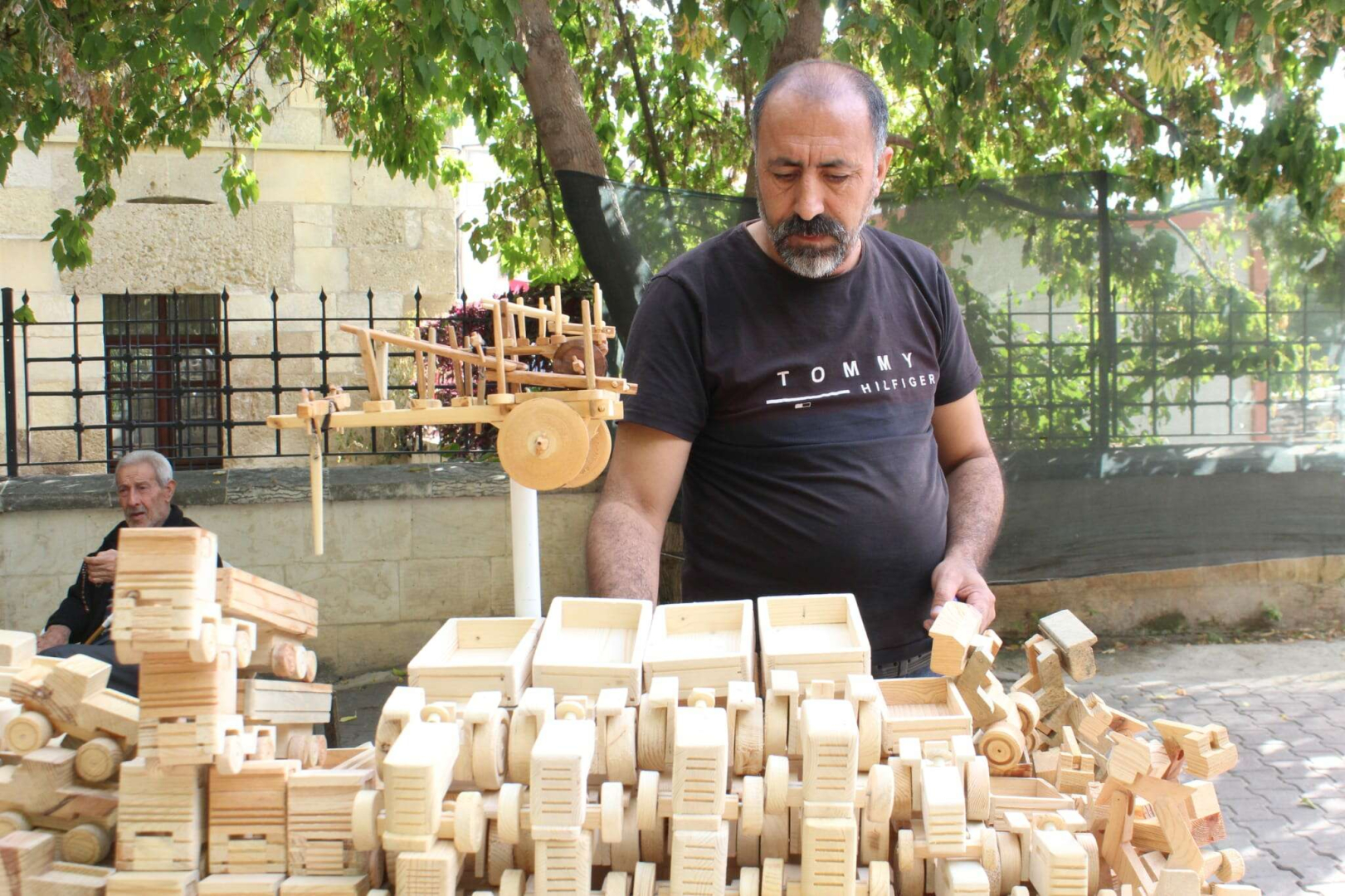 Ahşaptan oyuncaklar yapıyor, satmak için şehir şehir geziyor