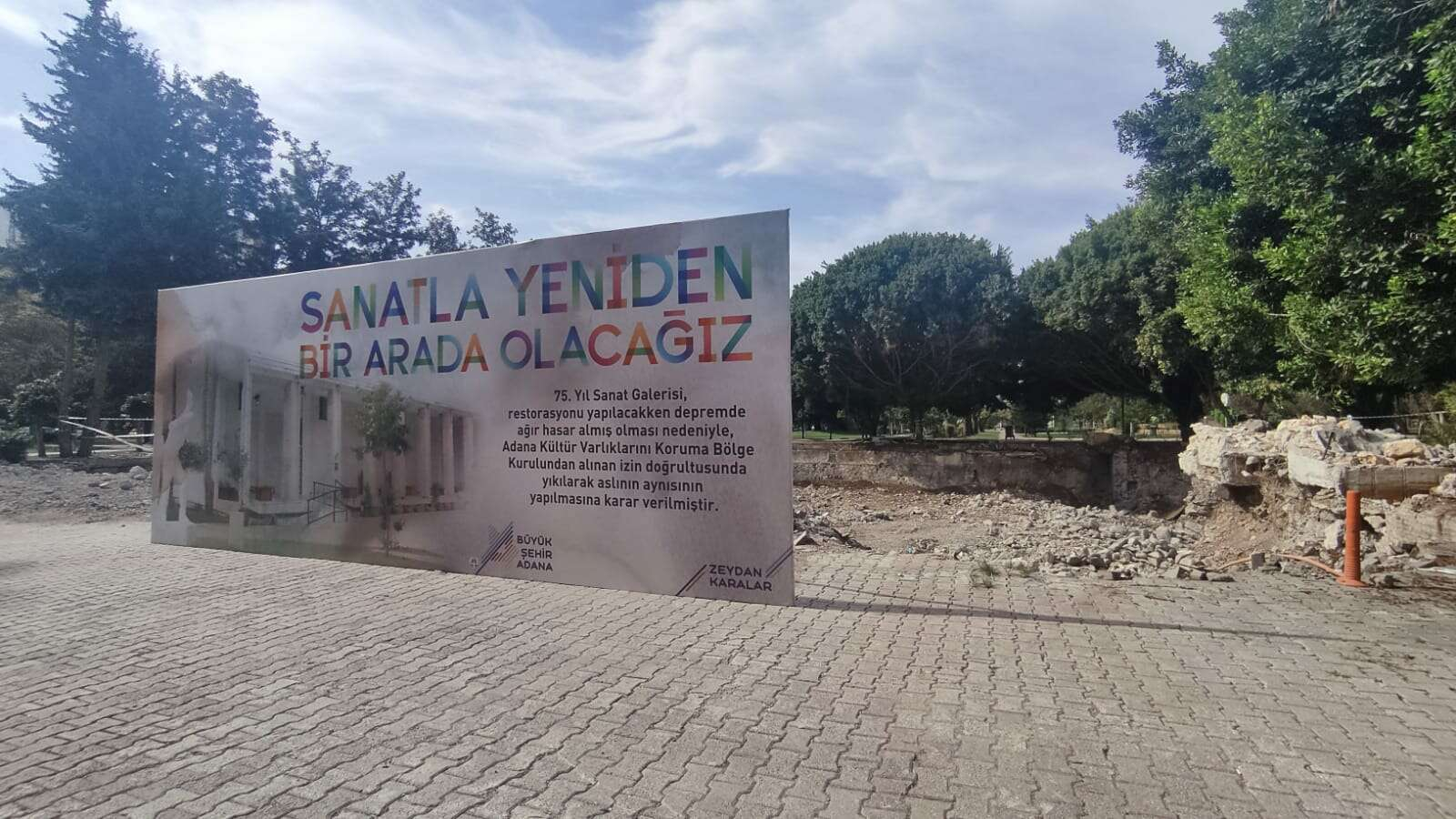 Yıkılan binanın önünde Adana Büyükşehir Belediyesi tarafından koyulan “75. Yıl Sanat Galerisi, restorasyonu yapılacakken depremde ağır hasar almış olması nedeniyle, Adana Kültür Varlıklarını Koruma Bölge Kurulu’ndan alınan izin doğrultusunda yıkılarak aslının aynısının yapılmasına karar verilmiştir” panosu bulunuyor.
