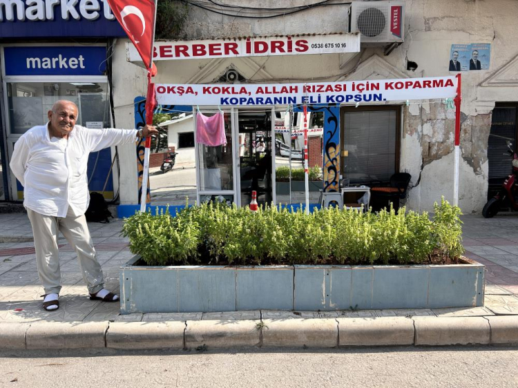 Hatay'da yaşayan berber İdris Özbek'in çiçek ektiği alana "Okşa, kokla Allah rızası için koparma. Koparanın eli kopsun" notu görenlerin ilgisini çekerken gülümsetiyor.