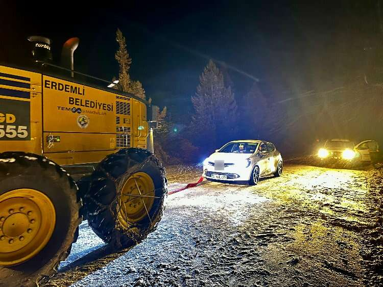 Erdemli ilçesi Toros Mahallesi’nde kapalı olan Karaman- Konya yoluna giren ve ardından ara yolda kara saplanan bir araçta bulunan 2 kişinin yardımına belediye ekipleri yetişti. İzmir’e gitmek için yola çıkan iki vatandaş navigasyonun yanlış yönlendirmesiyle kapalı olan Karaman yolunda mahsur kaldı. Yoğun kar yağışı nedeniyle mahsur kalan vatandaşlar, telefonla Erdemli Belediyesine ulaştı. Vatandaşların çağrısı üzerine Fen işleri Müdürlüğü ekipleri harekete geçti. Yolda kalan vatandaşlar belediye ekipleri tarafından 4 saat süren çalışmayla kurtarıldı. Bölgedeki kar yağışı dolayısıyla belediye ekiplerinin teyakkuza geçtiği bildirildi.