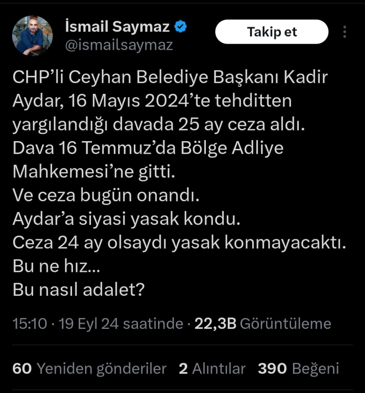 CHP’li Ceyhan Belediye Başkanı Kadir Aydar’ın 25 ay hapis cezası ve ardından gelen siyasi yasak, kamuoyunda geniş yankı uyandırdı. Gazeteci İsmail Saymaz, sosyal medya üzerinden yaptığı açıklamada, cezanın hızla onanmasını ve siyasi yasağın getirilmesini tepki gösterdi.