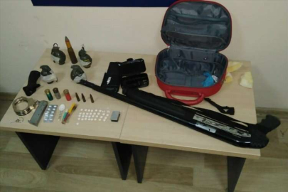Adreste yapılan aramada, 4 el bombası, doçka (uçaksavar) mermisi, 3 kalaşnikof mermisi, yarı otomatik av tüfeği, 2 av tüfeği kabzası, kelepçe, şarjör ve 33 uyuşturucu hap bulundu.
