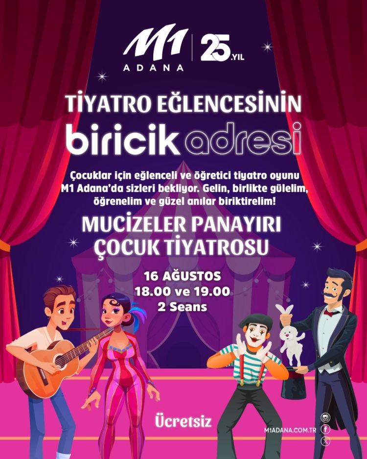 Adana’nın en büyük alışveriş ve eğlence merkezlerinden M1 Adana AVM, yaz tatilinde çocukları unutmadı. 16 Ağustos Cumartesi ve 17 Ağustos Pazar günleri düzenlenecek etkinliklerle minik ziyaretçiler, “Mucizeler Panayırı” tiyatrosu ve keyifli kukla gösterisiyle buluşacak. Etkinlikler, çocukların eğlenirken öğrenmesini sağlayacak çeşitli sahne performanslarını içeriyor.