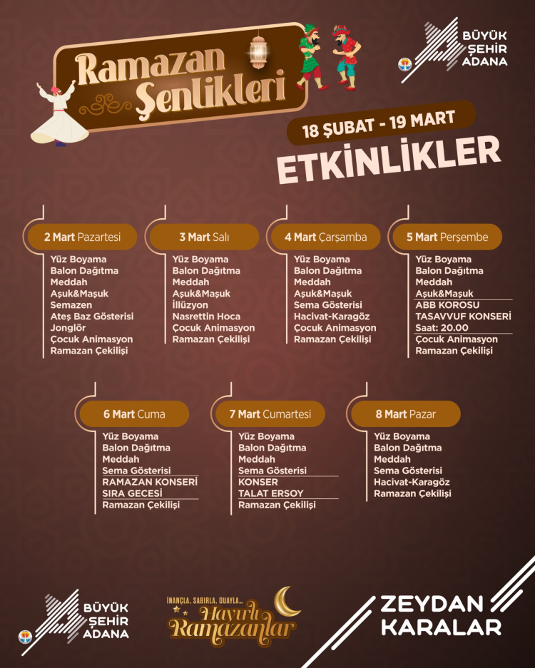 Adana Büyükşehir Belediyesi’nin sosyal medya hesabından yapılan paylaşımda, Ramazan coşkusunun Merkez Park’ta devam ettiği vurgulandı. Paylaşımda, meddah gösterileri, Hacivat–Karagöz oyunları, sema gösterileri, konserler ve çocuk etkinliklerinin programda yer aldığı belirtildi.