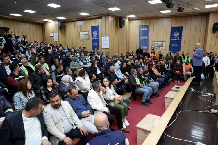 Akdeniz Belediye Başkanı Mustafa Gültak ise salonu dolduran işçilere hitaben, seçilip göreve geldiği ve işçilerle yaptığı ilk toplantıda verdiği sözü hatırlatarak; “O gün dedim ki siyaset yapmazsanız, işinize sahip çıkarsanız benim teminatım altındasınız. Sözümüzde de durduk. İşçimize mobbing yaptırmadım.