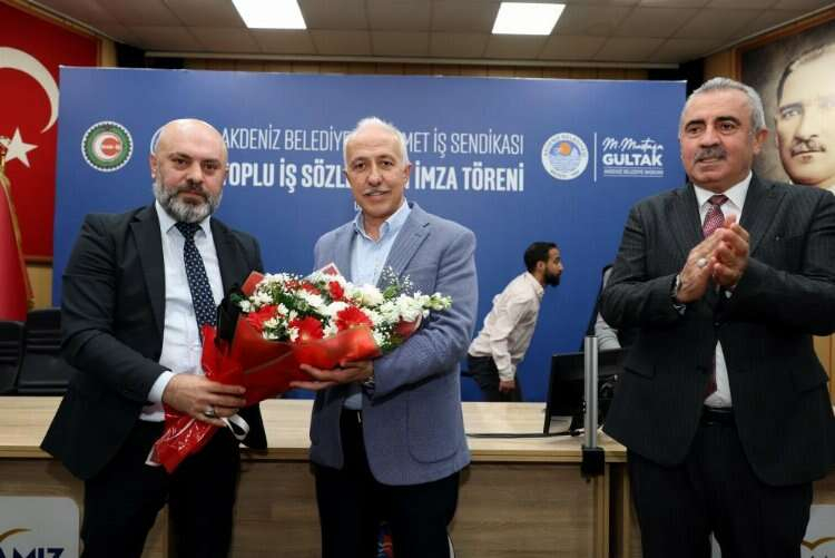 Belediye konferans salonunda düzenlenen toplu iş sözleşmesi imza törenine, Akdeniz Belediye Başkanı Mustafa Gültak, Hizmet-İş Genel Başkan Vekili Halil Özdemir, Hak-İş Mersin Şube Başkanı Mehmet Yüce, belediye başkan yardımcıları ve birim müdürleri ile belediyenin şirket işçileri katıldı. Protokol öncesi konuşma yapan Hizmet-İş Genel Başkan Vekili Halil Özdemir, işçi ve emekçi dostu Akdeniz Belediye Başkanı Mustafa Gültak sayesinde çok iyi bir sözleşmeye imza attıklarının altını çizerek teşekkür etti. Görüşmelerin aylarca sürdüğünü kaydeden Özdemir, “Nihayetinden Başkanımız son noktayı koyarak bu civarın en güzel sözleşmelerinden birini yapmamızı sağladı. Diğer il ve ilçelere bakınca maddi gelirleri, ekonomik kaynakları yüzde 100 fazla olmasına rağmen işçisine 1 lira verirken eli titreyen belediye başkanlarını da bildiğimiz için söylüyorum; bu kadar ekonomik sıkıntıya rağmen yine Akdeniz Belediyesi, işçisini ekmeğe muhtaç etmeden, enflasyona ezdirmeden bir toplu iş sözleşmesi imzalıyoruz” dedi.