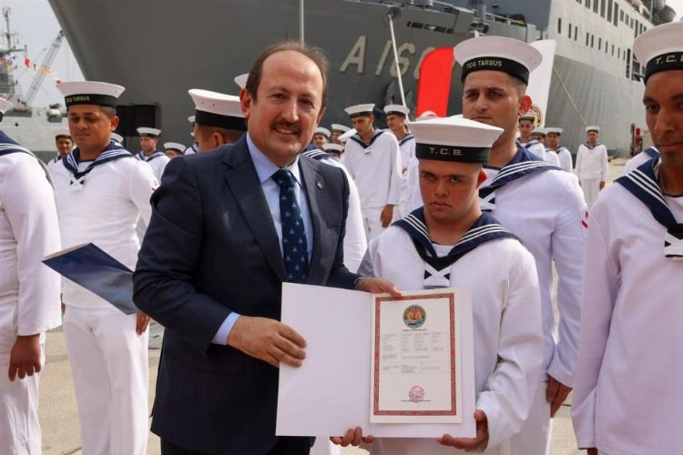 Vali Pehlivan ve protokol üyeleri yemin töreninde, 56 denizci ve 19 jandarma er olarak temsili askerlik yapan 75 engellinin terhis heyecanına ortak olurken, omuz omuza silah ve bayrak üzerine el basarak yemin eden engellilerin terhis belgelerini verdi.