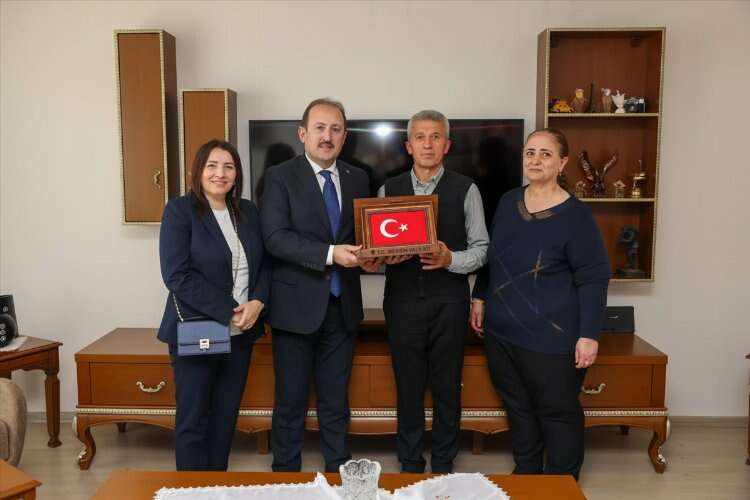 Vali Pehlivan ve eşi Yıldız Pehlivan, Gazi Emniyet Müdürü Kadir Topaktaş'ı merkez Yenişehir İlçesi 50. Yıl Mahallesi'ndeki evinde ziyaret etti.Topaktaş ve ailesine Türk bayrağı hediye eden Pehlivan, bayramlarını kutladı.