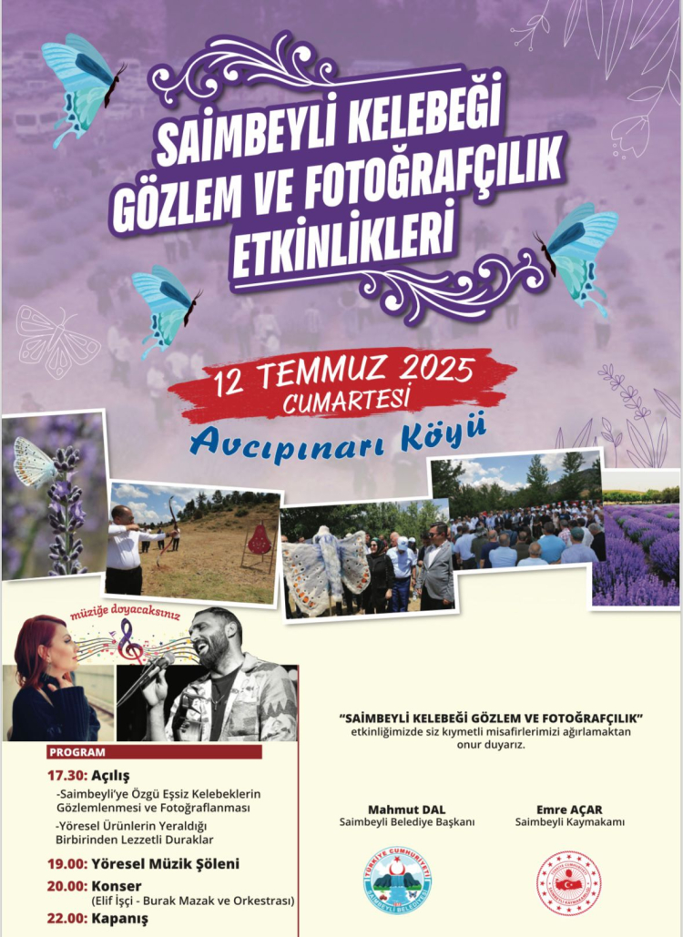 Saimbeyli Kaymakamlığı’ndan yapılan açıklamada, etkinliğin bölgeye özgü kelebek türlerinin korunmasına dikkat çekmek ve ekoturizmi geliştirmek amacıyla düzenlendiği belirtildi. Açıklamada, “Hem doğayla iç içe keyifli bir gün geçirmek hem de yerel üreticilerimizin doğal ürünlerini tanımak isteyen herkesi 12 Temmuz Cumartesi günü Avcıpınarı Mahallesi’ne bekliyoruz” denildi.