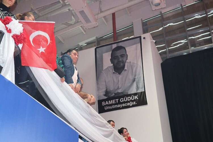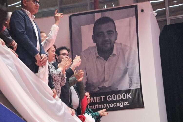 Genel başkanı ve Adana Başkan adaylarını heyecanla bekleyen partililerin yanı sıra kapalı spor salonunda bir şey dikkat çekti. Salonda geçtiğimiz günlerde silahla öldürülen Adana Büyükşehir Belediyesi Özel Kalem Müdür Vekili Samet Güdük’ün de afişi asıldı. Fotoğrafı bulunan ve altında ‘Unutmayacağız’ yazan afiş salonun çeşitli yerlerinde yer aldı.