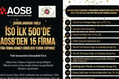 İstanbul Sanayi Odası’nın (İSO) her yıl açıkladığı "Türkiye’nin 500 Büyük Sanayi Kuruluşu" 2021 listesinde Adana Organize Sanayi Bölgesi’nden (AOSB) 15 firma yer aldı.
