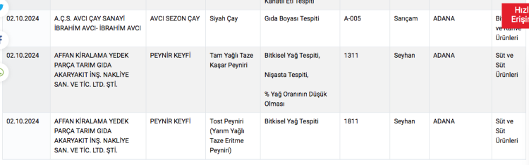 Tarım ve Orman Bakanlığı sitesinde yayımlanan listede, Adana’da gıdalarla oynayan o firmaların isimleri şöyle: