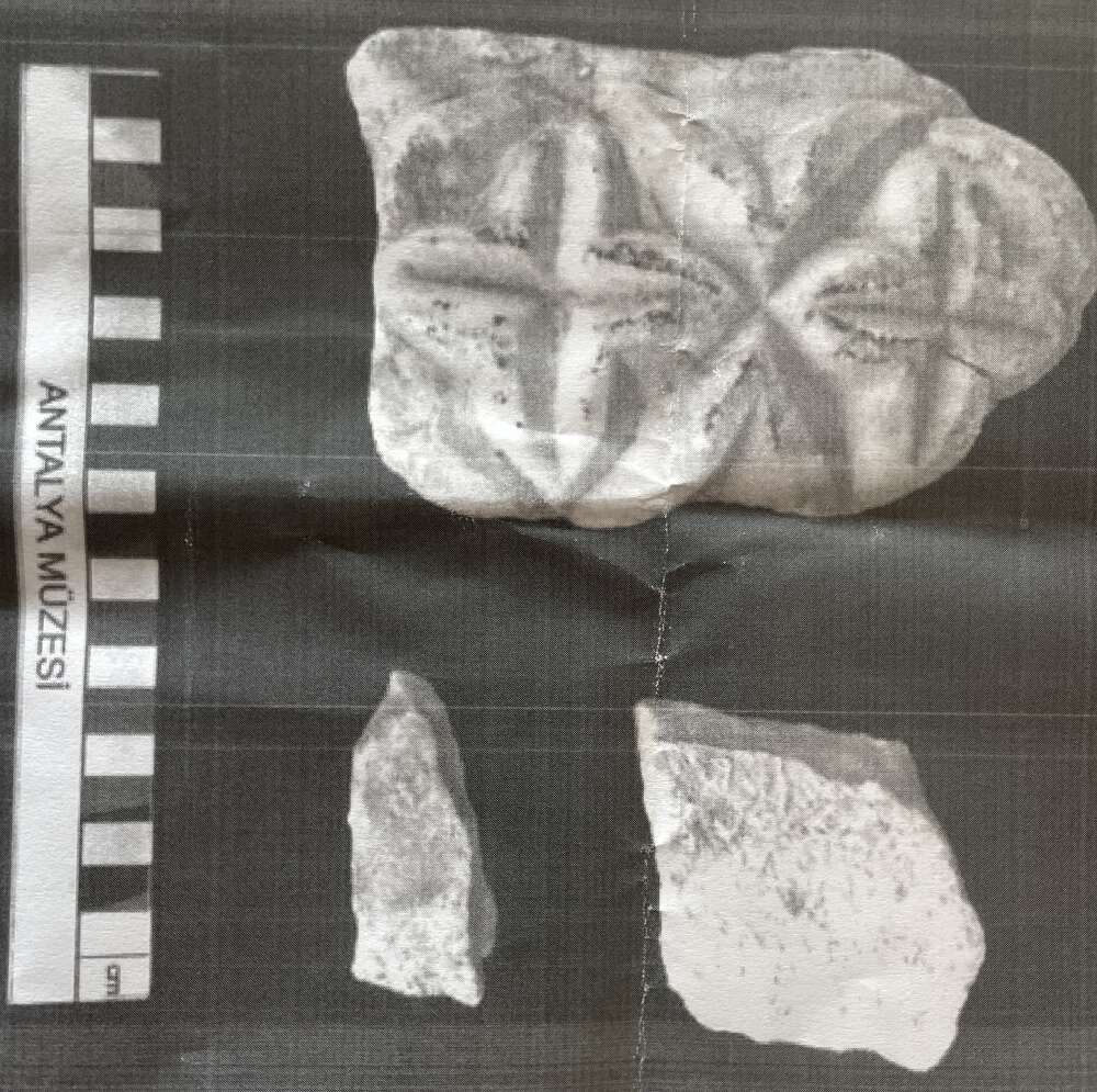 Raporda, ele geçirilen tarihi eserlerden "bezemeli mermer parça"nın 16 santimetre uzunluğunda, 11 santimetre genişliğinde merkezine haçı andıran stilize 2 rozet figürünün işlenmiş olduğuna yer verildiği kaydedildi.
