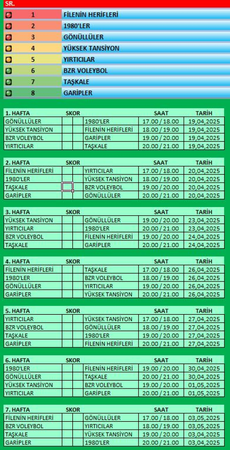 Turnuvanın 4. Haftası 26 Nisan 2025: Filenin Herifleri-Taşkale, 1980’ler-BZR Voleybol, Gönüllüler-Yırtıcılar, Garipler-Yüksek Tansiyon, 5. Hafta: Yırtıcılar-Yüksek Tansiyon, BZR Voleybol-Gönüllüler, Taşkale-1980’LER, Garipler-Filenin Herifleri